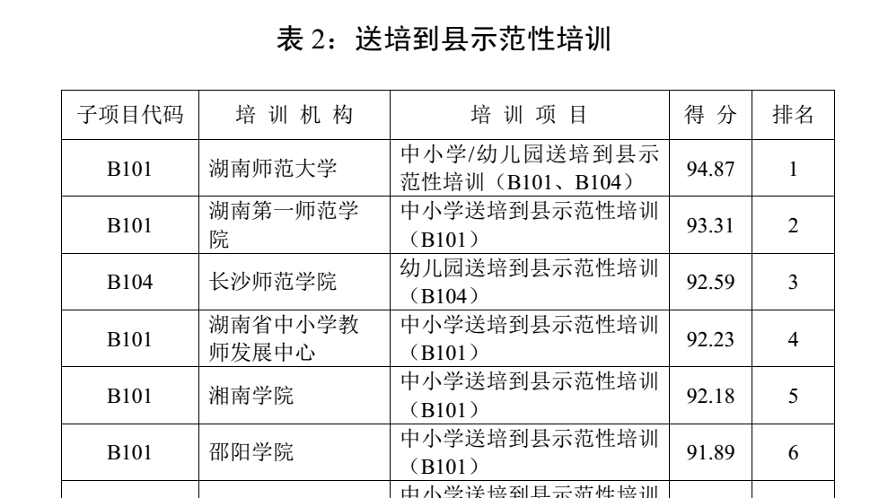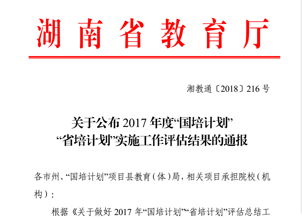 (杨栋)近日,湖南省教育厅下发《关于公布2017年度“国培计划”、“省培计划”实施工作评估结果的通报》(湘教通[2018]216号)文件,通报了全省2017年度“国培计划”“省培计划”项目实施绩效综合评估结果,我校承办的各项目在绩效评估中取得优异成绩。由省干训办负责实施的“国培”中小学及幼儿园教师“送培到县”项目排名均为全省第一,而省干训办组织的5个高中校长(书记)项目则创下了包揽“省培”所有项目排名前五名的佳绩。其中,11个项目在同类项目排名中位居前30%,由资源与环境科学学院负责实施的省级教师工作坊被评为全省A类等级。