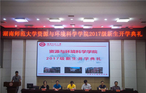 9月15日下午3点,资源与环境科学学院2017级新生开学典礼于至善楼学术讲堂举行。资环院院长谢炳庚、党委书记彭才华、副院长周国华、谭长银、胡雪松、部分教师代表及学工办杨惠君,新生辅导员郑楠出席典礼,开学典礼由党委副书记陈媛主持。