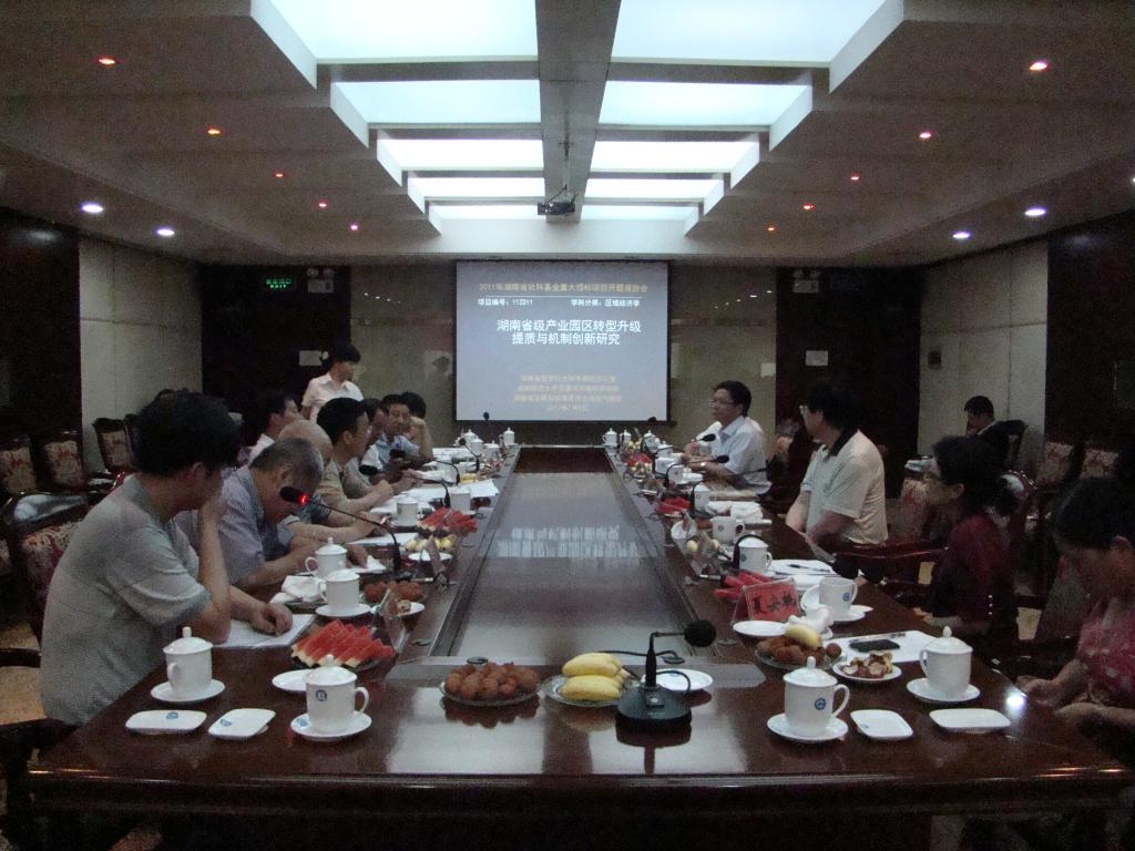 2011年7月5日上午,我校资源与环境科学学院副院长周国华教授主持的湖南省哲学社会科学基金重大招标项目——《湖南省级产业园区转型升级提质与机制创新研究》开题报告会在红楼四楼会议室举行。省社科规划办主任骆辉、副主任王礼生和由省国土资源厅方先知厅长担任专家组组长,湖南商学院柳思维教授、省政府经济研究信息中心副主任唐宇文研究员、原主任贝兴亚研究员、我校资源与环境科学学院院长谢炳庚教授组成的专家组出席了报告会。常务副校长卢岳华教授、副校级督导朱翔教授、社科处处长唐贤清教授以及项目组全体成员参加报告会。报告会由省社科规划办主任骆辉主持。