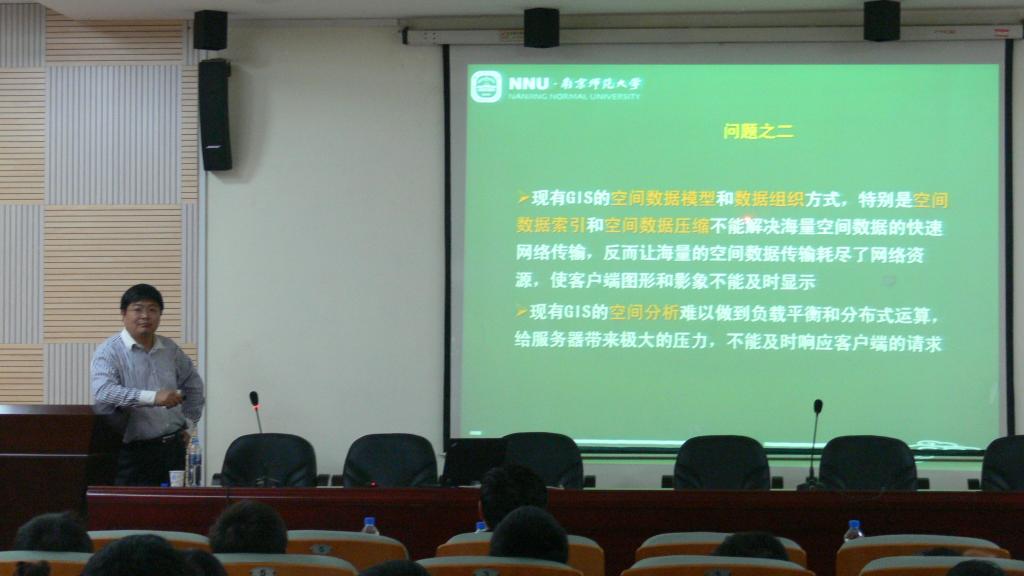 秦建新老师首先对本次讲座作了致辞,并对闾国年教授的到来表示热烈欢迎。接着,闾国年教授就GIS的历史与发展前景位同学们做了系统介绍。吕教授的详细介绍以及他带来的个人专利让同学们深深感受到了GIS最前沿的魅力,赢得了大家的阵阵掌声。会后吕教授与秦建新老师共同为“GIS DAY”