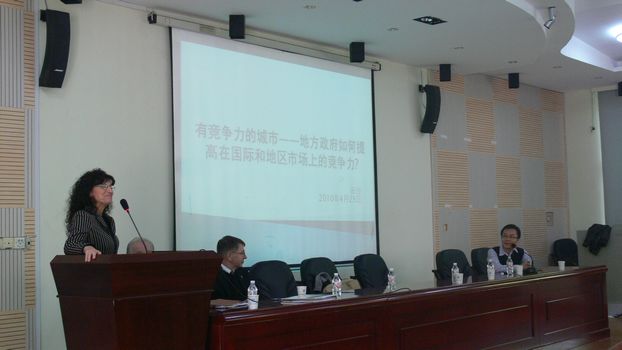 2010年4月23日上午,学院在301报告厅举行了一场主题为“政府在城市管理、地方经济发展和环境保护中的作用”的国际学术交流报告会。报告会由美国国际城市管理协会高级顾问、原安纳波利斯市行政长官Robert Agee (罗伯特·阿吉)先生和美国国际城市管理协会高级顾问、美国环球人力资源咨询公司主席Ted Samaras (泰德·萨马拉斯)女士主讲。随行的美国国际城市管理协会高级顾问、新项目负责人Deilinger, Judit (尤迪·德利格)先生和美国国际城市管理协会高级顾问、中国地区负责人罗丽军女士等列席了报告会。