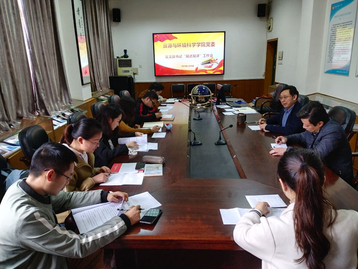 3月28日下午,资源与环境科学学院党委在学院201会议室举行2018年度党支部书记述职评议会。院党委书记彭才华、党委副书记陈媛、党委宣传委员胡雪松参加会议,会议由学院党委组织委员覃志斌老师主持。