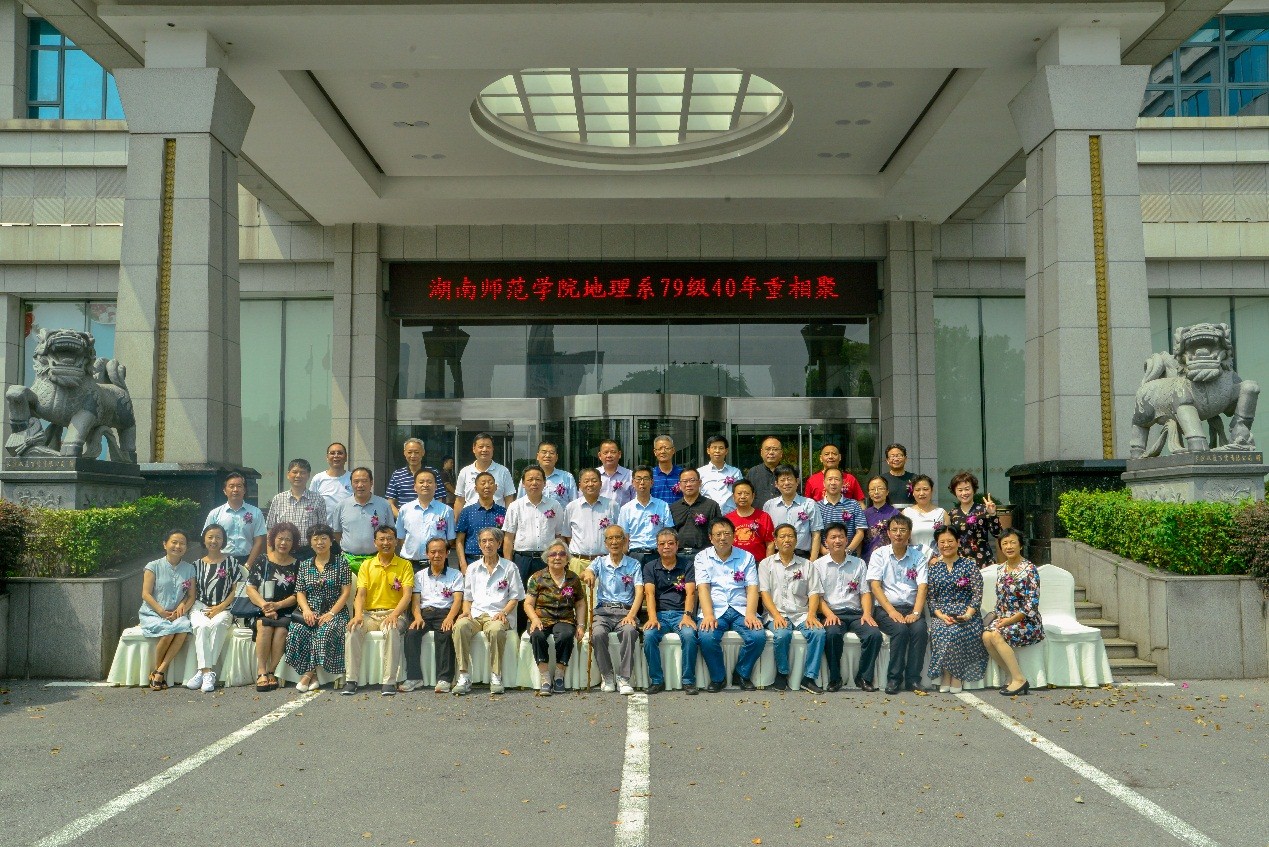 2019年9月14日,中秋佳节次日,原湖南师范学院地理系1979级35位校友回到母校,共庆相识40年。湖南师范大学副校长周俊武教授、校友总会副秘书长彭正乔老师、资源与环境科学学院院长谢炳庚教授、资源与环境科学学院党委书记彭才华老师及部分任教老师等参加活动。庆祝活动由李建云校友主持,谢炳庚院长代表学院对校友返校表示热烈欢迎,并向校友介绍了学院发展状况,教师代表孙云仙、李景保和班主任朱翔老师先后发言,对1979级校友表示欢迎和祝福,曾四喜、蒋忠诚、熊小兰等校友先后发言,畅谈对母校的感恩和对老师的感激之情。周俊武副校长在讲话中,代表学校热烈欢迎原地理系1979级校友返校,他向校友们介绍了学校发展历程、学校发展的关键时间节点和重大事件,对包括地理系1979级校友在内的所有校友长期以来对母校的支持和帮助表示衷心感谢,诚挚邀请各位校友常聚麓山、常回母校。