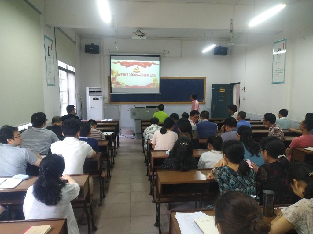 2019年9月5日,资环学院党委在217教室组织庆祝中华人民共和国成立70周年主题宣讲,主题为《新中国70年的奋斗历程和启示》,宣讲会由党委书记彭才华主持,副院长胡雪松同志作主题宣讲。