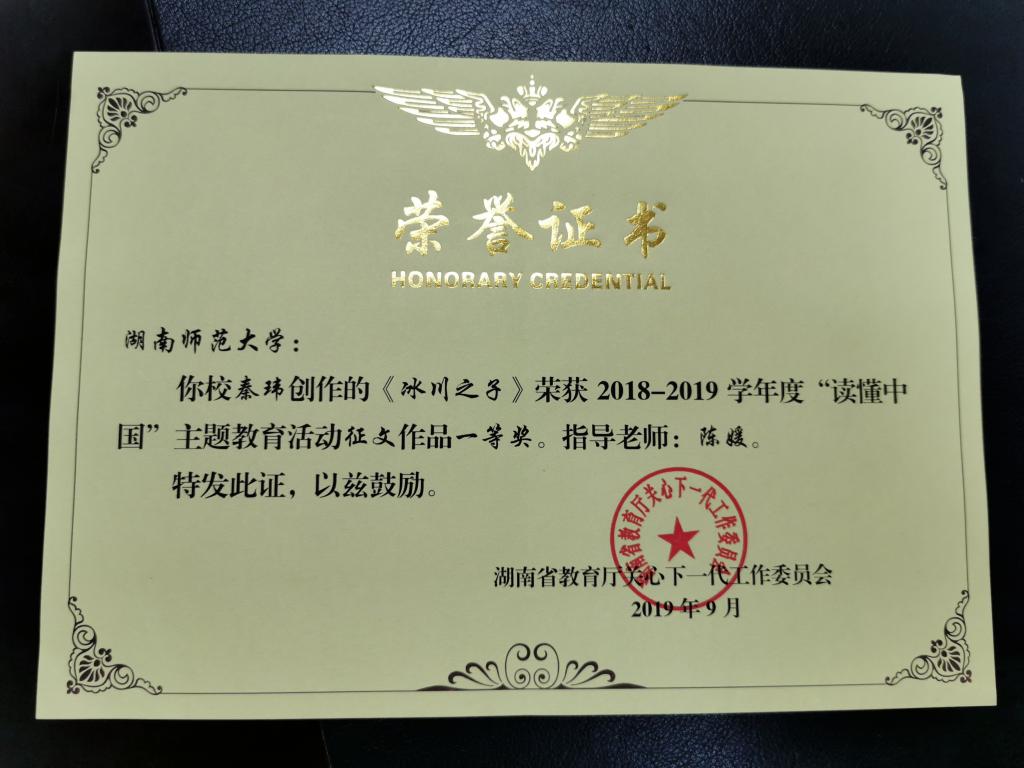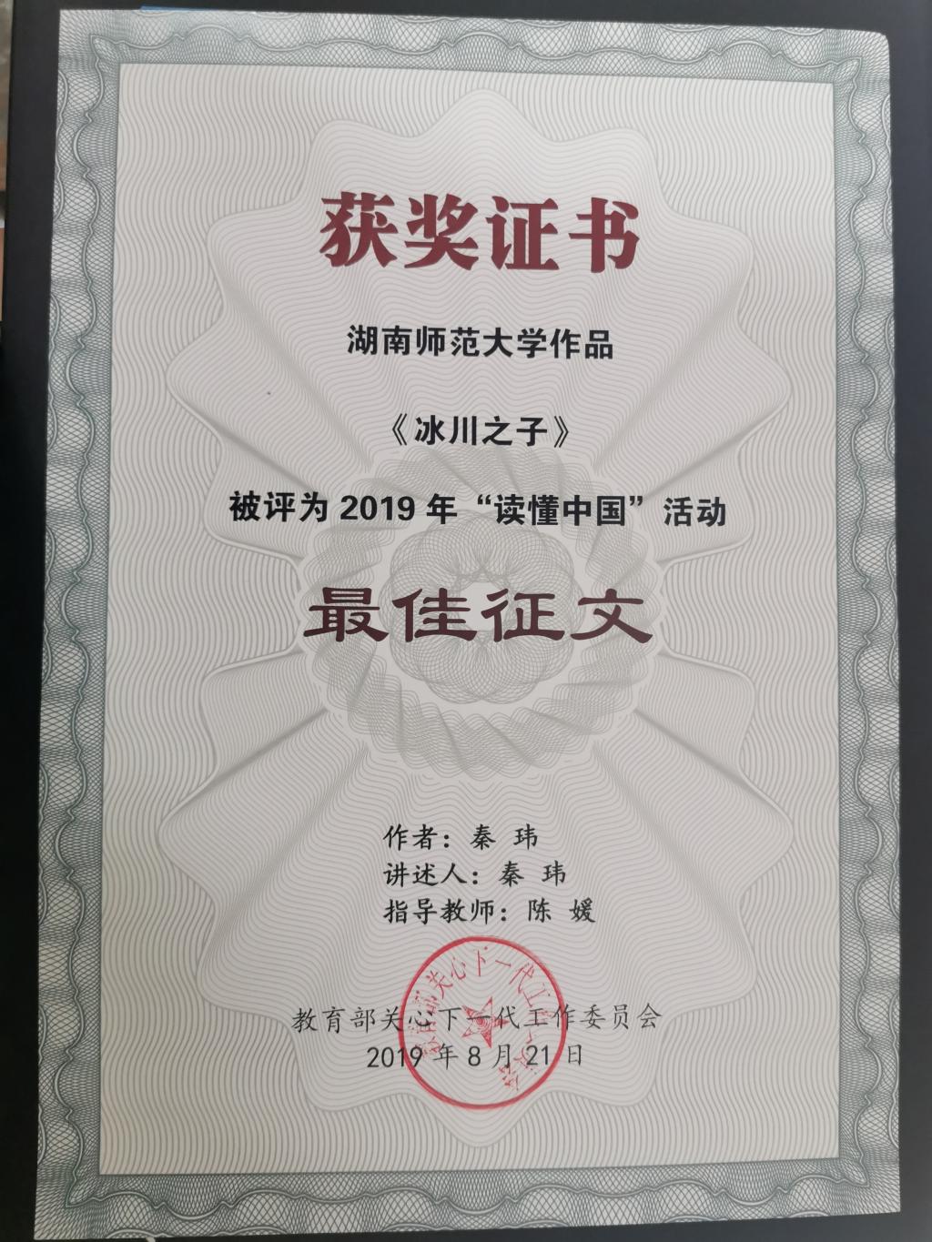 《冰川之子》在湖南省普通高校“读懂中国”主题教育活动征文比赛中,从全省63所普通高校,719个院系,30多万学生中脱颖而出,获评“湖南省一等奖”。连同其余11篇省级优秀征文作品,共同被报送至教育部关工委“读懂中国”活动组委会进行角逐,最终在全国各省优秀征文中,获评“最佳征文”。