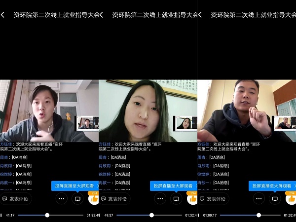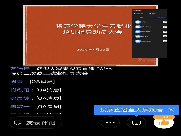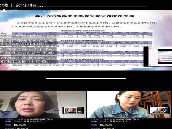 (通讯员 罗静伟 谢宇宸)4月23日下午,学院学工办组织召开了大学生云就业培训指导动员大会。受新冠病毒疫情影响,今年毕业生的各项工作都不同程度受到影响,学生也出现不同程度、不同状况的心理问题,“毕业与就业”越来越成为2020届毕业生的“当务之急”的重要议程,也成为了当前国家强调的六项稳定工作之一。据统计分析,我校毕业生的就业率比往年同期有所下降,为了加强对365官网毕业生的指导,提高学生对就业工作的认识,学院学工办通过“钉钉”平台线上直播的方式组织召开了大学生云就业培训指导动员大会,学院党委副书记陈媛,学工办全体老师以及学院2020届全体毕业生和400余名全日制本科生参加会议。