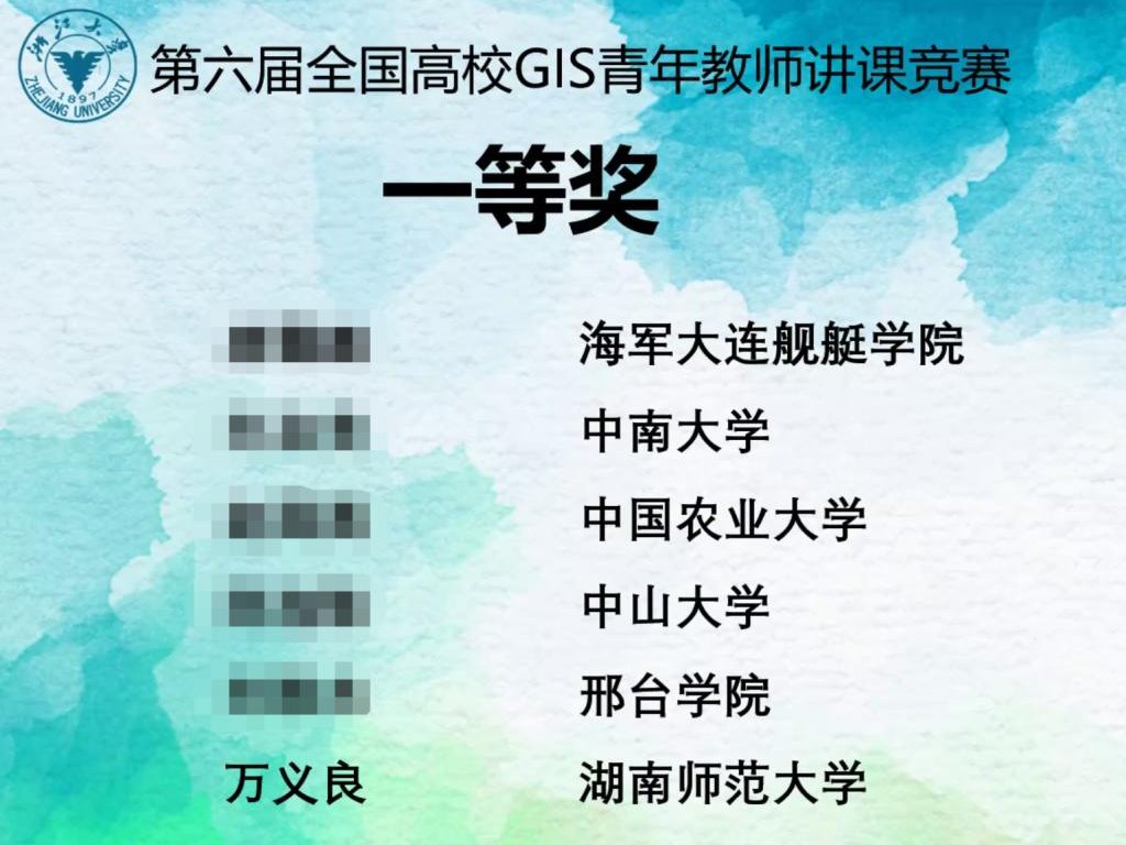 8月3日- 4日,由中国地理信息产业协会、中国地理学会、浙江大学、南京师范大学主办,中国地理信息产业协会教育与科普工作委员会、中国地理学会教育工作委员会、浙江大学地球科学学院承办的第六届全国高校GIS青年教师讲课竞赛,经过两天的紧张赛程在浙江杭州圆满结束。365官网青年教师万义良老师代表湖南师范大学参赛,荣获第六届全国高校GIS青年教师讲课竞赛一等奖。