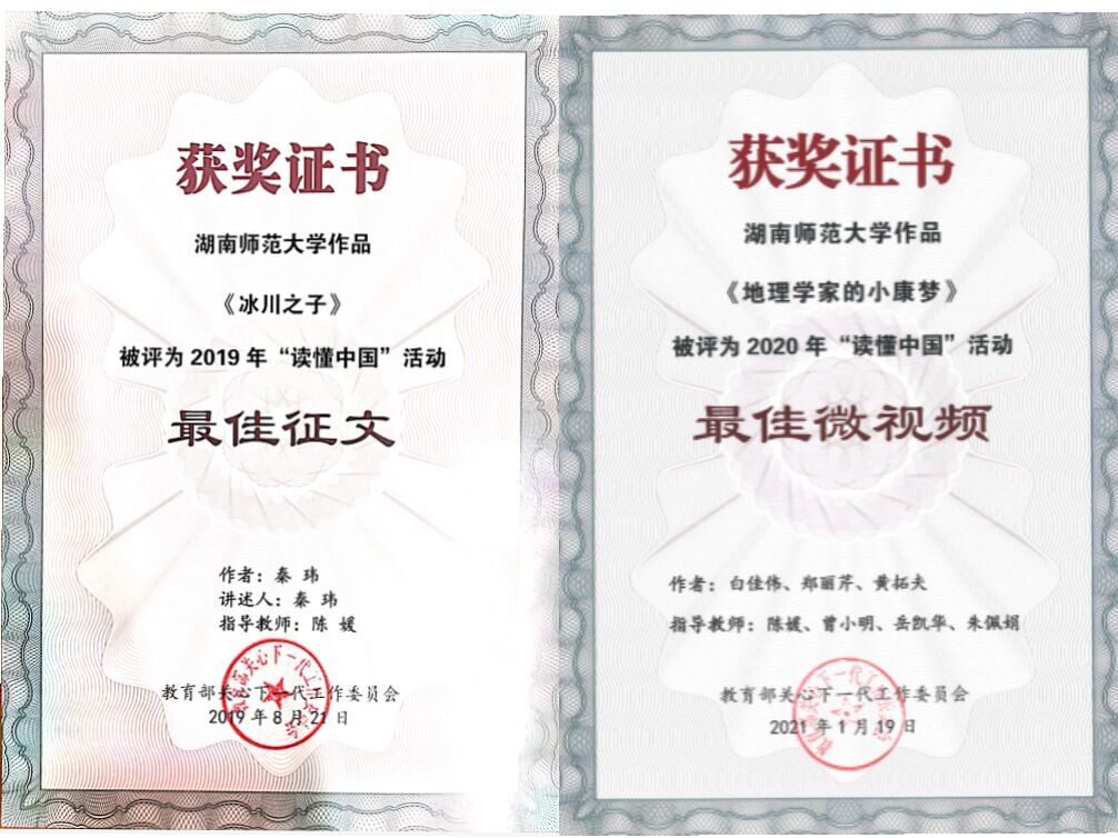 近年来,365官网关工委深入贯彻落实习近平总书记对关心下一代工作的重要指示精神,在学校关工委的关心指导下,在学院党委行政的领导下,围绕立德树人根本任务,注重专业特色,充分发挥老教授优势,积极探索新时代二级关工委建设的新要求、新特点,深度参与学校学院“三全育人”工作,努力创建二级关工委工作品牌,育人工作取得了可喜成绩。学院关工委活动立项连续3年被学校关工委评为“优秀项目”;在湖南省教育厅关工委主题教育活动中学院关工委连续3年获评“优秀作品奖”,2020年获评主题教育活动“优秀组织奖”;2019年学院学生撰写的《冰川之子》在教育部关工委组织的“读懂中国”主题教育活动中获评“最佳征文”、2020年学院主创的《地理学家的小康梦》又获评“读懂中国”活动“最佳微视频”奖,并先后在中国教育电视台一套(CETV1)、湖南教育电视台、湖南广播电台等新闻媒体进行展播。