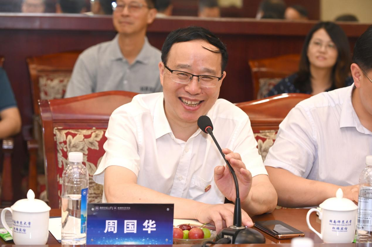 周国华院长从发展沿革、专业建设、教学科研平台、研究特色、教学科研获奖及杰出校友等方面介绍了学院学科发展基本情况,从学院文化建设、师资队伍建设、科学研究和学位点建设等方面介绍了学院发展的构想,并请专家从高水平人才团队引进、科研方向整合、研究生培养模式创新、合作研究等方面提出意见和建议。