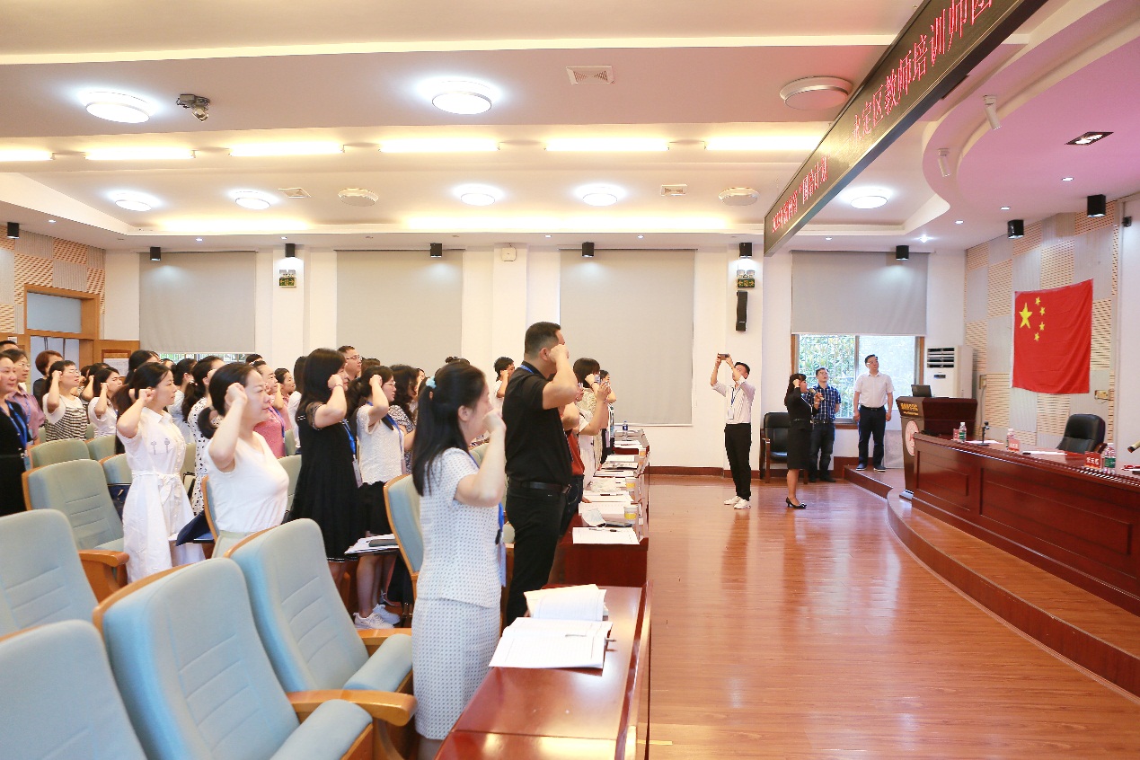 王磊副院长从培训主题、培训内容、服务团队、考核要求等方面对本次培训方案进行了解读。会上,全体学员宣读了培训师誓词,齐唱了班歌,使参训学员们感受到浓浓的班级氛围。张家界崇实北校张祎副校长作为学员代表发言,她用“感谢、追光、卓越”三个词语阐述了参加此次培训的感想。承诺将迅速转变角色,在专家引领,同伴互助、自我反思中实现从教学到培训,从教者到师者的转变。在接下来的培训中认真完成学习任务,努力开发培训课程资源,成为高素质、专业化、接地气、用的上、干得好的教师培训师,为永定教师培训做出自己的贡献。
