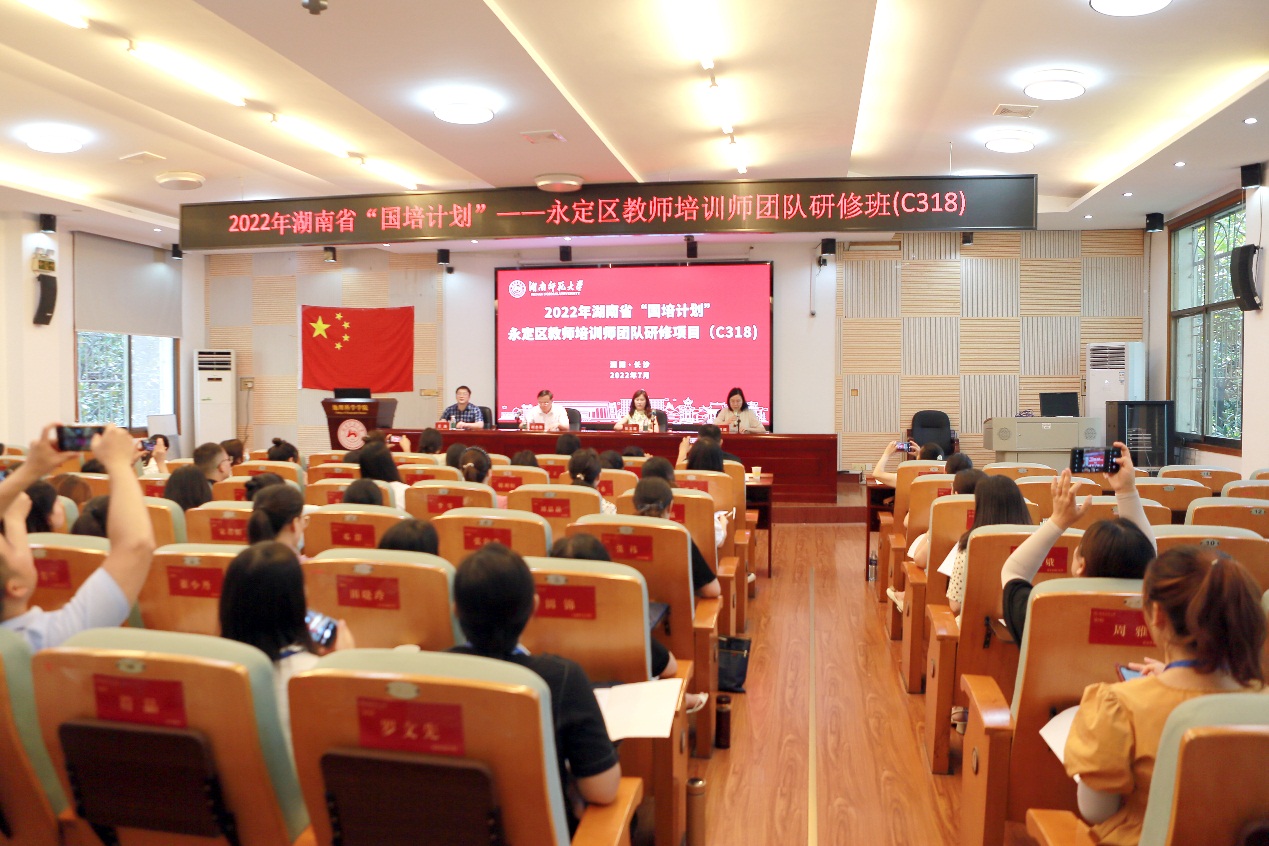 7月14日,2022年湖南省“国培计划”——永定区教师培训师团队研修项目(C318)在365官网301报告厅举行隆重的开班典礼。永定区教师进修学校岗培部主任张玉莲、365官网党委书记刘忠耿、副院长王磊以及来自永定区的60名一线骨干教师出席了典礼,典礼由365官网培训中心向思煜主持。