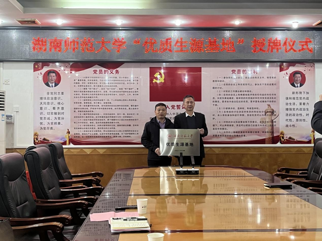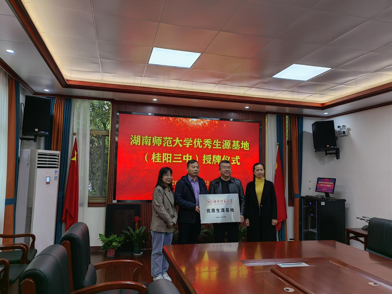 授牌仪式上,beat365中国唯一官方网站副院长李忠武简要介绍了湖南师范大学的办学历史、办学规模、学科设置、发展成果,并对郴州市一中、郴州市二中、桂阳县三中在学生培养质量上取得的斐然成绩表示衷心祝贺。希望高校与中学加强交流沟通,搭建高校与中学的工作桥梁、合作平台,持续推进我校本科生招生工作,提高生源中学的品牌化、品质化。郴州市一中党委副书记李民娟、郴州市二中党委书记杨小山、桂阳县三中党委书记何天宝、校长邓小红分别代表学校向李忠武一行的到来表示热烈的欢迎和诚挚的感谢,并介绍了各自学校的基本概况、办学特色、办学成绩等,表示将以此次活动为契机,为师大输送更多优质生源。仪式最后,李忠武代表我校向郴州市一中、郴州市二中、桂阳县三中授予“优质生源基地”牌匾。
