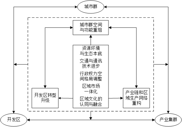 城市群是产业集群和开发区发展的空间载体;开发区是城市群创新的高地和产业集聚集群的重要场所;产业集群是推动开发区和城市群发展的重要驱动力。产业集群与开发区共享着城市群的资源、服务和市场,开发区通过产业集聚与创新,产业集群通过产业链延伸、耦合与创新,与城市群相互作用,协同发展(图2)。